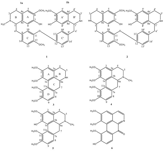 The dichloromethane extract was subjected to repeated silica gel column chromatography and preparative TLC to yield six alkaloids (16) among which compound 1 was identified to be a new bisbenzylisoquinoline-type alkaloid. Compounds 26 were identified as costaricine (2) [18], hernagine (3) [19,20], N-methyl hernagine (4) [20,21], corydine (5) [22], and oxohernagine (6) [21] upon comparison of their spectroscopic data with those reported in the literature (Figure 1). Compound 2, like compound 1, is a bisbenzylisoquinoline-type alkaloid. Compounds 35 are classified as aporphine-type alkaloids, while compound 6 is an oxoaporphine-type alkaloid.