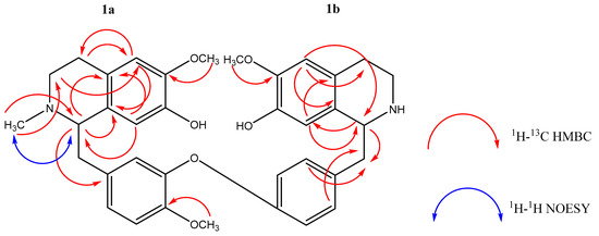 Analyses of the 1H (Table 1, Figure S2) and 13C NMR spectra (Table 1, Figure S3) indicated the presence of two 1,2,4,5 tetrasubstituted aromatic rings: ring A [δH 6.46 s (H-5); δC 110.8 (C-5) and δH 6.30 s (H-8); δC 114.1 (C-8)] and ring A’ [δH 6.55 s (H-5′); δC 111.3 (C-5′) and δH 6.73 s (H-8′); δC 112.5 (C-8′)], a 1,3,4-trisubstituted aromatic ring (ring C) with a characteristic ABX spin system [δH 6.58 (d, J = 1.9 Hz, H-10; δC 121.6, C-10), δH 6.85 (d, J = 8.5 Hz, H-13; δC 112.6, C-13) and δH 6.89 (dd, J = 8.5, 1.9 Hz, H-14; δC 125.6, C-14)] and a 1,4-disubstituted aromatic ring (ring C’) with a characteristic AA’BB’ spin system [δH 7.15 (d, J = 8.5 Hz, H-10′ and H-14′; δC 130.6, C-10′ and C-14′) and δH 6.83 (d, J = 8.5 Hz, H-11′ and H-13′; δC 118.3, C-11′ and C-13′)]. The two piperidine moieties (rings B and B’) were evident from the 13C NMR spectrum, which revealed the following resonances: two methine carbons at δC 64.7 [C-1; δH 3.71 (t, J = 5.2 Hz, H-1)] and δC 56.8 (C-1′; δH 4.18 (dd, J = 9.4, 3.8 Hz, H-1′) and four methylene carbons at δC 47.7 (C-3), δC 40.8 (C-3′), δC 25.4 (C-4), and δC 28.6 (C-4′). The 1H and 13C NMR spectra also exhibited signals at δH 2.84–2.90 (m, H-αa and H-αa’), δH 3.05–3.13 (m, H-αb), and δH 3.17 (dd, J = 14.0, 3.8 Hz, H-αb’), which were attributable to the pair of methylene protons bonded to C-αC 40.1) and C-α’ (δC 41.5) (Figure S4). The singlets at δH 3.80, δH 3.82, and δH 3.81 in the 1H NMR spectrum, assignable to the methyl carbon resonances at δC 55.9, δC 56.2, and δC 56.0 in the 13C NMR spectrum, were ascribed to the three methoxyl groups at 6-OCH3, 12-OCH3, and 6′-OCH3, respectively. The connectivity between substructures A-C in partial structure 1a and substructures A’-C’ in partial structure 1b and the position of the methoxyl groups in rings A, A’, and C were unambiguously established using the HMBC experiment (Table 1, Figure 2, Figure S5). The four quaternary aromatic carbons at δC 144.2 (C-7), δC 145.3 (C-11), δC 144.1 (C-7′), and δC 156.4 (C-12′) suggested that they were oxygenated.