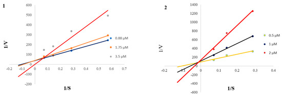 Kinetic studies were subsequently carried out on compounds 1 and 2, which actively inhibited the BChE, in order to determine their mode of inhibition. As illustrated in the Lineweaver–Burk plot analyses (Figure 3), compounds 1 and 2 both displayed mixed-mode inhibition against BChE as indicated by their data lines, which either intersected in the first (for compound 1) or second (for compound 2) quadrants. This type of inhibitor is able to bind to the active site of the enzyme, as well as at different sites of the enzyme (allosteric site) due to the allosteric effect [40,41]. The inhibition constants, Ki, were derived from the secondary plots for compounds 1 (0.67 µM) and 2 (0.05 µM), implying that compound 2 has a 13-fold higher affinity to BChE compared to compound 1.