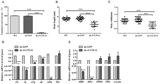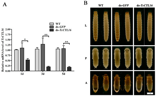 2.3. TcCTL16 Silencing in Early Larvae Influence Growth and Development