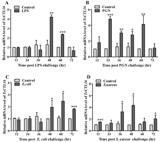 4.5. Expression Profiles of TcCTL16 after Being Challenged with Polysaccharides and Bacteria