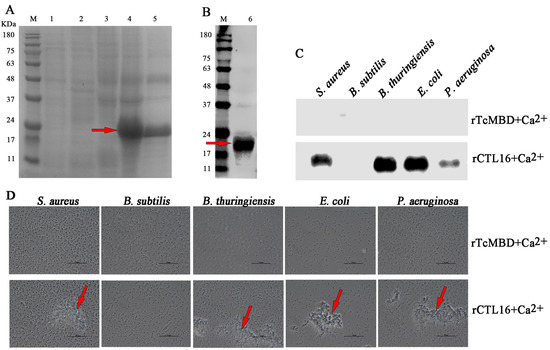 2.5. Production of rTcCTL16 CRD and Its Binding and Agglutination Capacity to Microbes