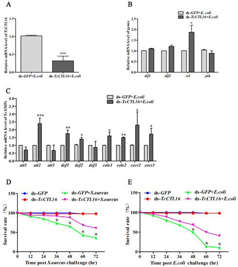2.7. Effects of TcCTL16 Gene Knockdown on Defense against Bacterial Infection