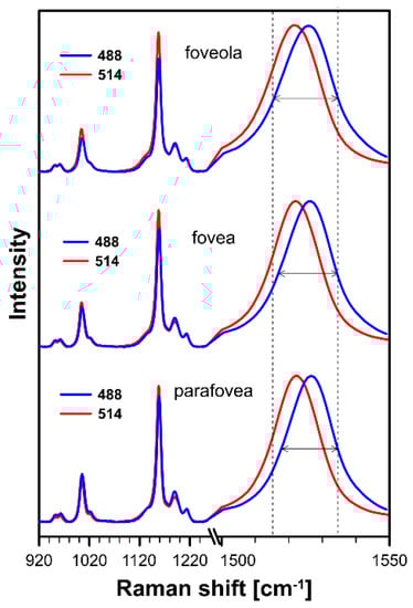 Raman spectra recorded with the application of a microscopic system from three different locations of preparation of the human retina: foveola, fovea, and parafovea. Spectra were recorded with two laser lines being preferentially in resonance with lutein (488 nm) or zeaxanthin and meso-zeaxanthin (514 nm). Note that the ν1 band representing the C=C stretching vibrations is shown on an enlarged scale. The retina is from a healthy 18-year-old female donor.