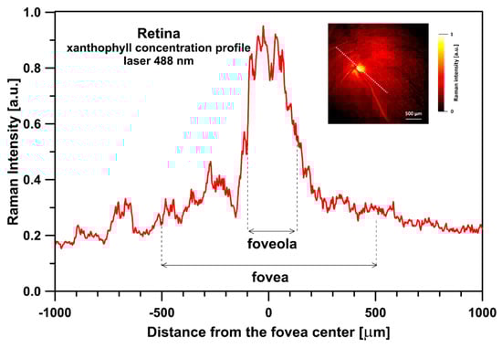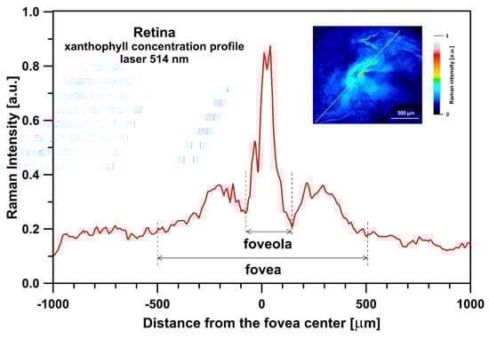Optical cross-section analysis of the human retina based on the integration of the ν1 band of Raman spectra recorded with the application of a 514 nm laser line in the course of imaging the preparation shown in the inset. The direction of the cross-section is drawn with a dashed line. Detailed analysis of the contribution of lutein and zeaxanthin to the cross-section presented is shown in Figure S4. The retina is from a healthy 35-year-old male donor.