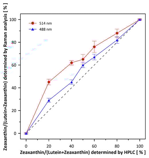 Validation dependencies of Raman spectroscopy-based determination of Lut and Zea fractions. Raman spectra were recorded from chromatographically pure 10-µM Lut and Zea mixtures in ethanol. Fractions of Lut and Zea were determined based on the Gaussian deconvolution of the ν1 spectral band (as shown in Figure S3). Note the deviations from the ideal linear relationship (dashed line) depending on the current resonance conditions for Lut and Zea scanned with the 488 nm and 514 nm lasers. Experimental points are the average from 10 different determinations ± S.D. R2 of the individual fits were in the range of 0.93 to 0.99.