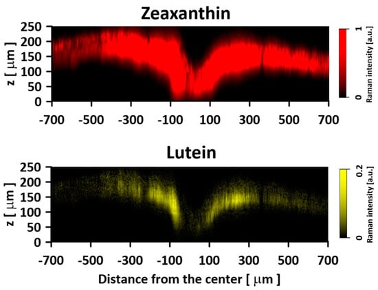 The human eye is an organ equipped with the ability of precise and color vision thanks to the densely packed cone photoreceptors located in the central part of the retina [,]. It turns out that in the optical path of photons incident on this area of the retina, there is a structure called the macula [,]. The entire human retina contains yellow xanthophyll pigments, lutein (Lut), zeaxanthin (Zea), and meso-zeaxanthin (m-Zea, see Figure S1 for chemical structures), but their concentration in the macula is ~100 times higher compared to the peripheral regions of the retina [,]. Moreover, the fraction of Zea and m-Zea in the central retina exceeds the fraction of Lut (Zea + m-Zea/Lut ≈ 2), and the proportion is inversed in the peripheral region (Zea + m-Zea/Lut ≈ 0.3) [,]. This heterogeneous distribution of macular xanthophylls in the human retina raises questions about the particularly high concentration of yellow pigments in the central region and the specific role of Zea and m-Zea in the macula. It has been proposed that one of the possible advantages of the higher accumulation of Zea compared to Lut is related to the higher efficiency of neutralization of reactive oxygen species potentially dangerous to photoreceptor membranes []. On the other hand, the yellow, xanthophyll-rich layer of the retina is not located near the photoreceptors, but the macular pigments are preferentially in the outer plexiform layer [,]. This suggests that, in addition to the anti-oxidation function of macular xanthophylls, other modes of their physiological activity have to be considered. Another widely accepted physiological function of macular xanthophylls is filtering short-wavelength radiation [,,,]. A particularly high concentration of macular xanthophylls in the central part of the retina seems to create excellent conditions for this role. In general, the retina is protected from excessive light by a regulatory mechanism based on pupillary constriction, but this process operates in the diameter range of 7–2 mm, so it does not protect the most central part of the retina called the fovea []. Fortunately, the macula covers this area of the retina. The xanthophyll pigments present in the macula effectively absorb blue light thanks to the system of conjugated double bonds forming their molecular skeleton []. On the other hand, the spectroscopic properties of Lut and Zea are not fundamentally different, which raises the question of the possible physiological significance of the accumulation of both types of pigments in the retina and their heterogeneous distribution. In the present work, we address these issues by examining human retinal preparations with the application of confocal resonance Raman microscopy and confocal fluorescence lifetime imaging microscopy (FLIM).