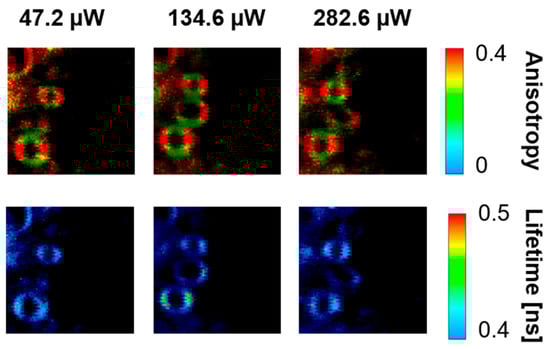 FLIM images of the optical cross-sections of single axons located between the outer plexiform layer and the photoreceptor layer of the human retina. The upper panels show fluorescence anisotropy, and the lower panels show fluorescence lifetime. Images were recorded with the different laser intensities shown above. The retina is from a healthy 57-year-old male donor.