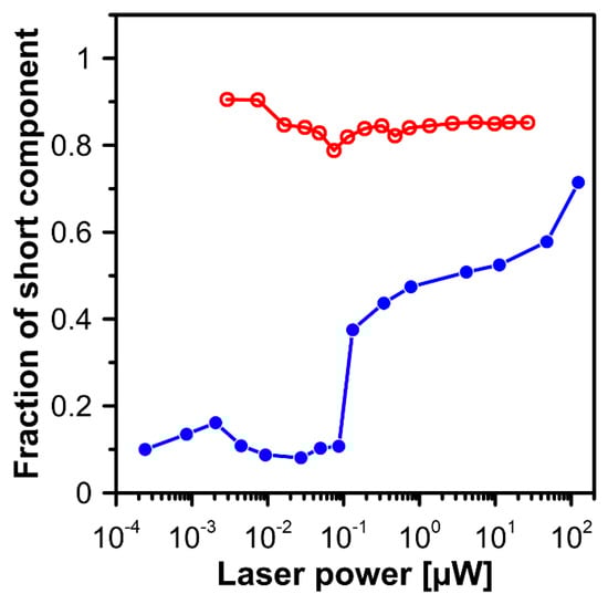 Laser power dependency of the fraction of the short-lifetime component in fluorescence recorded from axons located between the outer plexiform layer and the photoreceptor layer (images shown in Figure 6, red open symbols) and in the outer plexiform layer (the dependence redrawn from Figure 2c of the publication [], blue filled symbols).