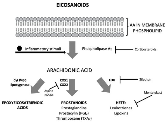 Pathway of biosynthesis of eicosanoids from arachidonic acid. Eicosanoids are not stored within cells and are synthesized as needed when their biosynthesis is activated by trauma/inflammation or cytokines which activate phospholipase A2 (PLA2). Fatty acids that are cleaved by PLA2 from cell membranes are then oxygenated by one of three different families of enzymes to produce eicosanoids [].