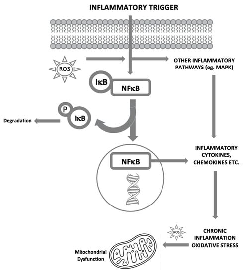 The bidirectional links between inflammation and oxidative stress. Reactive oxygen species (ROS) can act as inflammatory trigger initiating inflammation. On the other hand, inflammation induces oxidative stress. IkB, inhibitory subunit of NFkB; MAPK, mitogen-activated protein kinase; NFkB, nuclear factor kappa-light-chain-enhancer of activated B cells; P, phosphate; ROS, reactive oxygen species [].