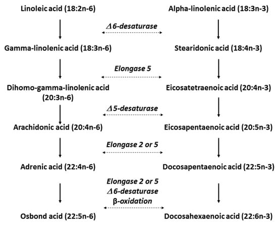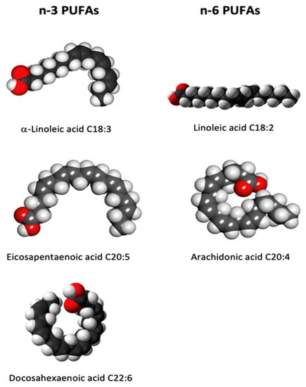 α-linolenic acid (ALA, 18:3 omega-3), eicosapentaenoic acid (EPA, 20:5 omega-3) and docosahexaenoic acid (DHA, 22:6 omega-3) are all omega-3 fatty acids whilst linoleic acid (LA, 18:2 omega-6) and arachidonic acid (AA, 20:4 omega-6) belong to omega-6 fatty acids (see Figure 3). Although the human body cannot synthesize them, mainly because of the deficiency of one of the conversion enzymes, the omega-3-desaturase, it is able to metabolize them [].
