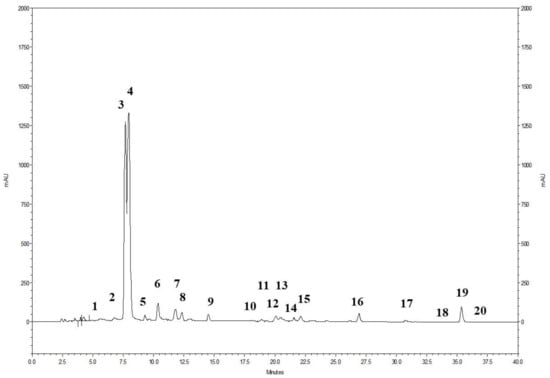The phenolic profile of the powdered pomegranate extract (PWE), as shown in Figure 1, involved the analysis of 20 ellagitannins. The prominent peaks observed corresponded to punicalin A and B (peak 3 and 4) and ellagic acid (peak 19) (Figure 1). Additionally, the presence of ellagic acid derivatives (peaks 1–2, 5–18, and 20) was also identified. The chromatogram demonstrates that ellagitannins are the predominant class of phenolic compounds in pomegranate peel and marc (a by-product consisting of seeds and peels), constituting over 99% of the total content of pomegranate phenolics. Among the ellagitannins, punicalins, which are major constituents of pomegranate by-products, accounted for more than 77.0% of the total phenolic content in PWE (Table 1). Ellagic acid derivatives and ellagic acid itself contributed to 20.5% and 2.1% of the total phenolic content in PWE, respectively (Table 1).