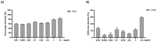 The anti-radical activity of PWE was evaluated with the DPPH and SOD-like assays. The results are shown in Figure 2. PWE was tested at different concentrations (0.01–0.025–0.05–0.1–0.25–0.5–1–3.3 mg/mL). PWE displayed a strong dose-dependent radical scavenging effect, which reached about 75% inhibition at the highest concentrations in the DPPH assay.