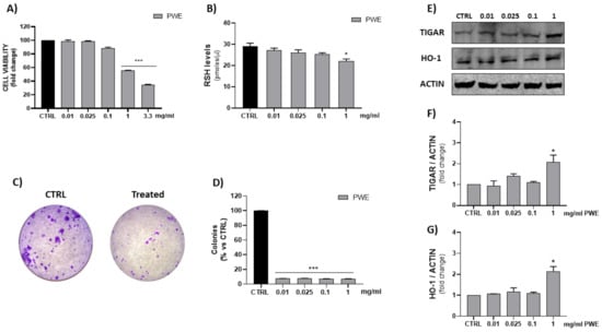 Evaluation of PWE effect on BPH-1 cell viability (A). Measurement of RSH intracellular content (B). Representative images of single-cell clone proliferation, stained with crystal violet and colony quantification (C,D). Evaluation of HO-1 and TIGAR expression in BPH-1 cells treated with different concentrations of PWE (E–G). Results are expressed as mean ± SEM. (* p < 0.05; *** p < 0.0005 vs. CTRL).