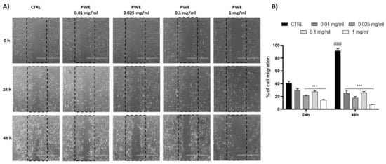 PWE effect on cell migration rate at 24 and 48 h (A,B). Image magnification is 1000 μm. Results are expressed as mean ± SEM. (### p < 0.0005 vs. CTRL 24 h; *** p < 0.0005 vs. CTRL 24 h, CTRL 48 h).