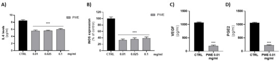 Since the effects of low concentrations of PWE (0.01–0.025–0.1 mg/mL) on pro-inflammatory protein levels were similar, we evaluated whether the lower concentration (0.01 mg/mL) was able to decrease pro-angiogenic PGE2 and VEGF proteins. The results obtained showed that 0.01 mg/mL PWE was able to significantly decrease PGE2 and VEGF levels (Figure 5C,D).