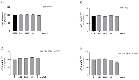 Assessment of cell viability after PWE treatment in H5V cell culture at 24 h (A) and 48 h (B). Effect of CM collected from BPH-1 cells and PWE at different concentration on H5V viability after 24 h (C) and 48 h (D). The results are expressed as mean ± SEM. (*** p < 0.0005 vs. PWE 0).