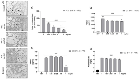 Tube formation in H5V culture after incubation with conditioned media (CM) collected from BPH-1 cells and added with different concentrations of PWE (image magnification 400 μm) (A,B). Measurement of PGE2 (C), VEGF (D), and nitrite/nitrate levels (E) in H5V treated with CM from BPH-1 cells and PWE at different concentrations. The results are expressed as mean ± SEM. (### p < 0.0005 vs. H5V control; * p < 0.05; ** p < 0.005; *** p < 0.0005 vs. PWE 0).