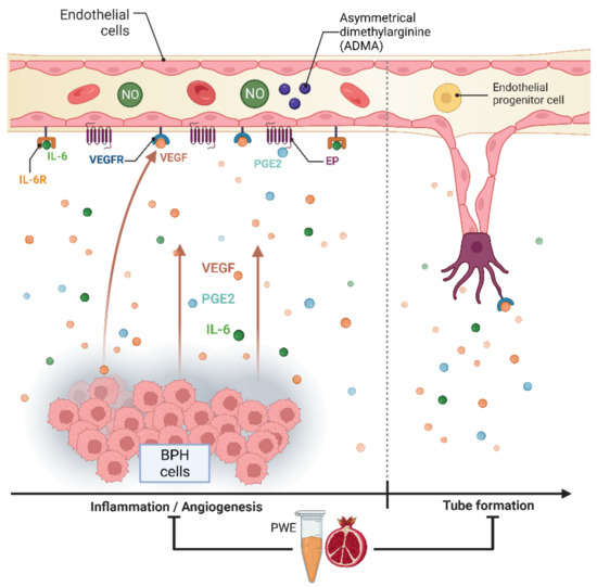 The results obtained in our experimental conditions demonstrated that PWE was able to, not only reduce BPH-1 cell proliferation and inflammation but, in agreement with Kim et al.’s data [23], also reduce angiogenesis in endothelial cells (Figure 8). In this study, we demonstrated that PWE suppressed proliferation and tube-like morphological changes in H5V vascular endothelial cells via inhibiting activation of VEGF and PGE2 increased by transferring CM from BPH-1 cells. It has been reported that any alterations in nitric oxide (NO) production may play an important role in the regulation of angiogenesis [55]. NO levels are controlled by endogenous NOS inhibitors including asymmetric dimethylarginine (ADMA), symmetric dimethylarginine (SDMA), and L-monomethylarginine (L-NMMA). ADMA is released from the methylated arginines of proteins during proteolysis and autophagy. Reddy et al. [55] reported that enhanced NO production and its downstream VEGF and HIF1 expression are due to reduced ADMA levels. In this study, we demonstrated that reduced ADMA levels measured in H5Vcells treated with CM from BPH-1 cells resulted in enhanced nitrite and nitrate (the stable metabolites of NO) production and its downstream VEGF expression. The results obtained in our experiment conditions demonstrated that the reduction in tube-like morphological changes in H5V cells treated with PWE was according to the increase in ADMA levels and the reduction in nitrite/nitrate levels.