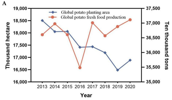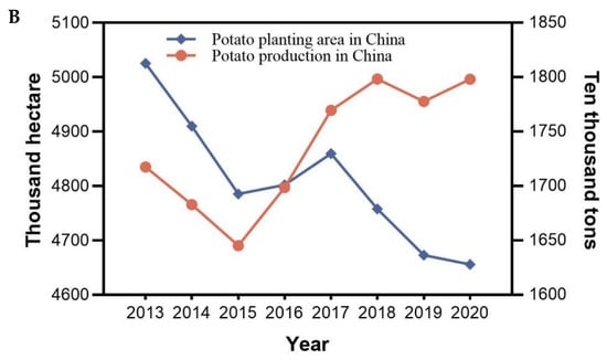 Potato planting area and fresh food production from 2013 to 2020. (A) Global potato planting area and fresh food production from 2013 to 2020. (B) Potato growing area and production in China from 2013 to 2020 (global potato planting area and fresh food production data source: https://www.fao.org/faostat/en/ (accessed on 15 April 2023); Chinese potato planting area and production data source: https://data.stats.gov.cn/ (accessed on 15 April 2023)).
