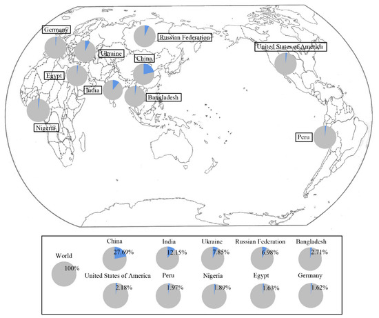 Proportion of potato growing area in the top ten countries in 2020 (data source: https://www.fao.org/faostat/en/ (accessed on 15 April 2023)).