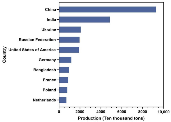 Fresh potato production in the top ten countries in 2020 (data source: https://www.fao.org/faostat/en/ (accessed on 15 April 2023)).