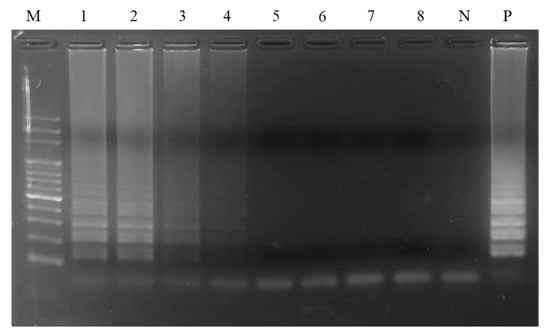 Analysis of the sensitivity of LAMP assay. The LAMP assay was performed by using the PO02 primer set. Lane M, 100 bp DNA ladder marker; Lanes 1–8, various amounts of PO genomic DNA (10 ng, 1 ng, 100 pg, 10 pg, 1 pg, 100 fg, 10 fg, and 1 fg) were used as templates for the LAMP assay; Lane N, negative control; Lane P, positive control.
