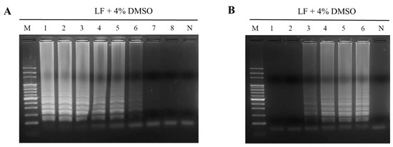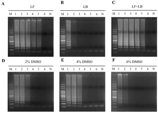 The reaction mixture of LAMP contained 1× ThermoPol Buffer (NEB, Ipswich, MA, USA), 6 mM MgSO4 (NEB, USA), 1.4 mM dNTP Mix (GeneMark, Taipei, Taiwan), 1.6 μM of respective inner FIP and BIP primer, 0.2 μM of respective outer F3 and B3 primer, 8 U of Bst DNA Polymerase (M0275L, NEB, USA), and different amounts of extracted genomic DNA, and the rest was mixed with sterile water to a total volume of 25 μL. After mixing well, the reaction was carried out in a 96-well thermal cycler (Veriti Thermal Cycler, Thermo Fisher Scientific, Waltham, MA, USA). The LAMP conditions were implemented at 63 °C for 60 min and then followed by a heating treatment for 10 min at 80 °C for the inactivation of enzyme catalysis. After the reaction, the resultant LAMP products were stocked at 4 °C up to further analysis. Optionally, to determine the effects of loop primers (LF and LB, in Table 1) and DMSO (dimethyl sulfoxide) treatment on the reactivity of LAMP, 0.4 μM of each loop primer and different concentrations ranging from 2% to 6% DMSO were supplemented to the reaction mixture for assessing LAMP product formation. As to negative and positive control, no DNA was added in the tube, and PCR amplified ITS2 DNA of PO was, respectively, used as template DNA.