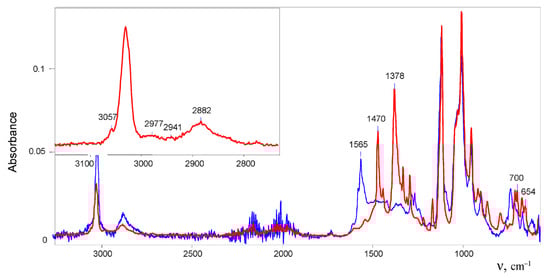 ATR IR spectra of the solid phase obtained by evaporation of a drop of a freshly prepared solution of CH3C(CH2Cl)3 and H{Cl11} in DCM on the surface of the crystal of the ATR accessory (blue) and salt (CCl2CHCHCH3)+{Cl11−} crystals formed from it (red).