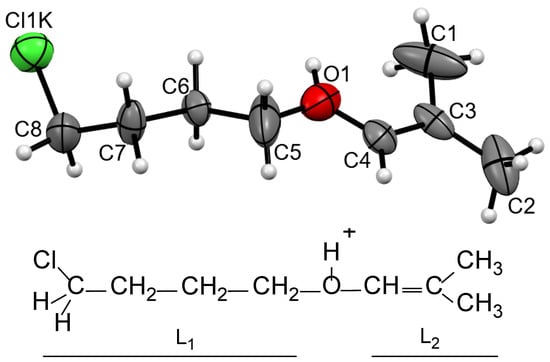 Previously, we researched the interaction of vinyl carbocations, C3H5+ and C4H7+, with water molecules in solutions of their salts in C6HF5 []. One of the objectives of the current work is to check how the chlorination of vinyl carbocations affects their interaction with water molecules. For their preparation, cyclobutylchloronium (CH2CH2)2Cl+ and divinylchloronium (CH2=CH)2Cl+ salts were used. The salt of cyclobutylchloronium is poorly soluble in C6HF5 if it contains trace amounts of water (the solvent was pre-dried with molecular sieves). Keeping this saturated solution over hexane vapor led to the isolation of 2–3 crystals from it after a few days. The center of each crystal contained a disordered crystallite, around which a regular crystal grew. This finding indirectly indicates that the crystals are formed by one of the products of the reactions occurring in solution. A piece of its outer part that was broken off from the crystal showed a good diffraction pattern. X-ray analysis showed that the crystal consisted of discrete {Cl11−} anions and two crystallographically independent cations (Figure S3 in Supplementary Materials). The cations were protonated ether L1–O(H+)–L2, in which both L1 and L2 contained four carbon atoms each (Figure 3). Its chloropropane moiety L1 contained single C–C bonds and a terminal CH2Cl group. The second group, L2, was isobutylene with one short CC bond of 1.274 and 1.278 Å for two crystallographically independent cations, which corresponded to the C=C double bond. All its four C atoms and oxygen atom deviated from the least-squares plane by 0.011 and 0.010 Å for both cations with the C–C–O angle close to 120°, confirming that it is an isobutylene group: (CH3)2C=CH–. Hereafter, this cation is referred to as I.