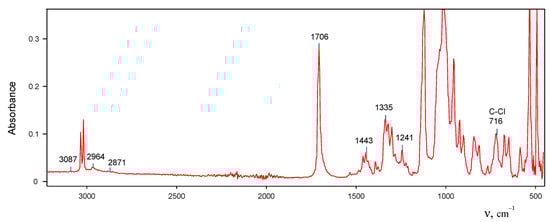 In the IR spectrum of the salt of cation I, there is a very intense band of C=C stretch at 1706 cm−1, whose frequency exceeds that of the neutral (CH3)2C=CHOH molecule (Figure 5). Obviously, the positive charge from the OH+ group almost does not reach the C=C bond. Furthermore, vibration frequencies of CH3 groups (2964 and 2871 cm−1) and of C–Cl at 716 cm−1 match those of the neutral molecules []. Therefore, the positive charge is actually situated on the OH+ group with the νOH frequency at 3087 cm−1.