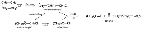 On the other hand, if cyclobutylchloronium or divinylchloronium salts are dissolved in C6HF5, then the chlorinated vinyl cations arising from them—by subsequently interacting with H2O—form precisely the protonated esters I and II, respectively. The formation of cation I from cyclobutylchloronium occurs in a high yield, and a rather obvious formation mechanism can be proposed (Scheme 3). In solutions in DCM, the butylene ring of the chloronium cation (CH2CH2)2Cl+ breaks, followed by its isomerization to tertiary chlorobutyle+, which, by releasing HCl, transitions into the vinyl isobutylene+ cation. Subsequently, the two nascent cations, chain chlorobutylene+ and isobutylene+, interact with a water molecule, thereby generating the final product: protonated ether I.