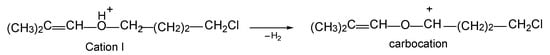Schematic representation of the possible formation of an O-containing carbocation from a protonated ether.
