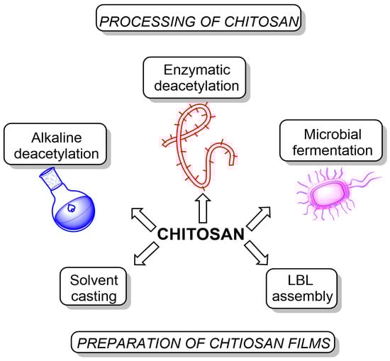 - Layer-by-layer assembly: this method involves the alternate deposition of oppositely charged polyelectrolytes (including chitosan) onto a substrate to produce multilayer films with controlled thickness and composition. The properties of these films, such as permeability, mechanical strength, and antimicrobial activity, can be tailored by adjusting the number of layers, the choice of polyelectrolytes, and the assembly conditions. Layer-by-layer assembled chitosan films have been used in applications such as food packaging with controlled release of antimicrobial agents and medical devices with tunable drug release profiles [26,27].