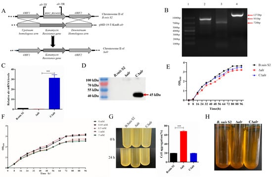 Construction and growth properties of B. suis Δalr and complemented strains. (A) Schematic of Δalr generation. (B) Agarose gel electrophoresis of the Δalr strain. Lanes: 1, upstream homologous arm fragment; 2, downstream homologous arm fragment; 3, KanR fragment. (C) qRT-PCR validation of the absence of alr gene expression in the deletion strain and restoration of expression in the complemented strain. (D) Verification of the CΔalr strain through Western blotting using mouse anti-Flag monoclonal antibody. (E) Growth curves of B. suis S2, ∆alr, and C∆alr in TSA medium. (F) Growth curves of Δalr with the addition of different concentrations of D-alanine. (G) Bacterial aggregation phenotype of the ∆alr strain. The three B. suis S2 strains were harvested at the exponential phase and left standing at room temperature for 24 h. The OD600 nm of 100 µL of the culture obtained before and after standing was measured to quantify the bacterial aggregation. (H) The phenotypes of B. suis S2, ∆alr, and C∆alr were assessed by acridine yellow staining, revealing smooth Brucella. All data are presented as the mean ± SEM of three independent experiments. *** p < 0.001.