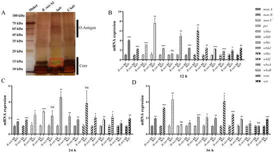 Detection of LPS integrity and expression of LPS-synthesis-related genes. (A) LPS stained with silver stain. The red box indicates the portion of the core polysaccharide that is lost in the Δalr. (B) Expression levels of Brucella genes at 12 h. (C) Expression levels of Brucella genes at 24 h. (D) Expression levels of Brucella genes at 36 h. All data are presented as the mean ± SEM of three independent experiments. * p < 0.05, ** p < 0.01, *** p < 0.001, and ns indicates no significant difference.