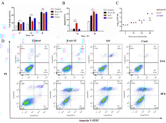 Enhanced intracellular survival of B. suis ∆alr and inhibition of macrophage apoptosis. (A) Intracellular LDH levels were detected at 12 h, 24 h, and 48 h post-infection of RAW264.7 cells with B. suis S2, ∆alr, and C∆alr. (B) Statistical analysis of the apoptosis rate of RAW264.7 macrophages. (C) CFUs were determined at 6 h, 12 h, 24 h, and 48 h post-infection of RAW264.7 cells with B. suis S2, ∆alr, and C∆alr. (D) Flow cytometry analysis of RAW264.7 cells collected at 24 h and 48 h post-infection with B. suis S2, ∆alr, and C∆alr, stained with FITC-labeled Annexin V and propidium iodide. All data are presented as mean ± SEM from three independent experiments. * p < 0.05, ** p < 0.01, *** p < 0.001, and ns, not significant.