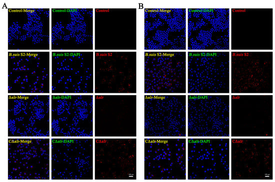 Brucella is a facultative intracellular parasite, and its virulence manifests mainly in the ability to proliferate within the host cells. The intracellular survival of Brucella was evaluated further by staining the nuclei of the RAW264.7 cells with DAPI (blue) and Brucella with Alexa Fluor 555 (red) and observing the infected cells by immunofluorescence confocal microscopy. The red fluorescence intensity of the macrophages infected with the ∆alr strain was significantly lower compared with the cells infected with B. suis S2 or C∆alr after both 24 h (Figure 4A) and 48 h (Figure 4B), which indicates a significant reduction in the number of intracellular bacteria in the case of the strain lacking Alr. Thus, the deletion of alr reduces the intracellular viability of B. suis in the macrophages assessed both by bacterial enumeration and by direct observation of the bacterium within the infected cells.