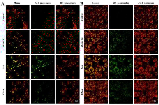 The effect of mutant strain ∆alr on MMP in RAW264.7 measured by JC-1 staining intensity. (A) RAW264.7 cells were infected with B. suis S2, ∆alr, and C∆alr at MOI 200 for 24 h. (B) RAW264.7 cells were infected with B. suis S2, ∆alr, and C∆alr at MOI 200 for 48 h. Scale bar, 100 µm. Fluorescence intensity was observed by confocal microscopy. Red fluorescence represents cells with normal MMP, green fluorescence represents cells with depolarized MMP, and orange indicates the overlap of red and green fluorescence.