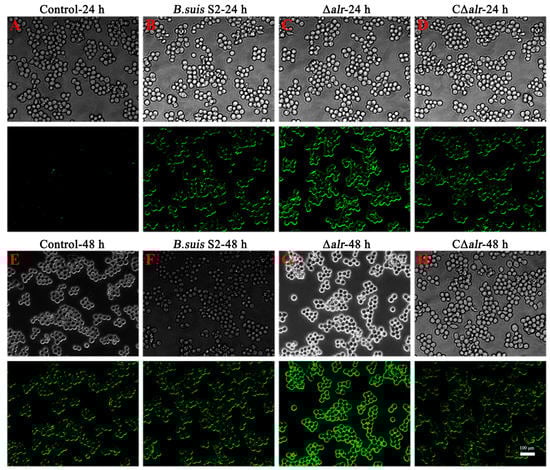 The bacterial aggregation assay was conducted following a previously published method, with certain adjustments []. In summary, B. suis S2, Δalr, and CΔalr were cultured until they reached the exponential phase, as previously described. Subsequently, the cultures were placed on test tube racks at room temperature and allowed to stand for 24 h. To determine the extent of bacterial aggregation, the optical density at 600 nm (OD600 nm) was measured using a microplate reader (Bio-Rad, Hercules, CA, USA) for 100 µL of the culture before and after the standing period. The percentage of bacterial aggregation was calculated using the following formula: