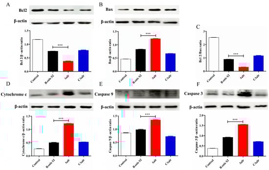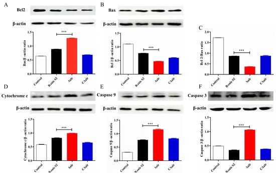 Expression of apoptosis-related proteins in RAW264.7 cells infected with B. suis for 48 h detected by Western blotting. (A) Ratio of Bcl2 to β-actin protein. (B) Ratio of Bax to β-actin protein. (C) Ratio of Bcl2 to Bax protein. (D) Ratio of Cytochrome C to β-actin protein. (E) Ratio of Caspase-9 to β-actin protein. (F) Ratio of Caspase-3 to Bax protein. The data are presented as mean ± standard deviation (SD) of triplicate assays. *** p < 0.001.