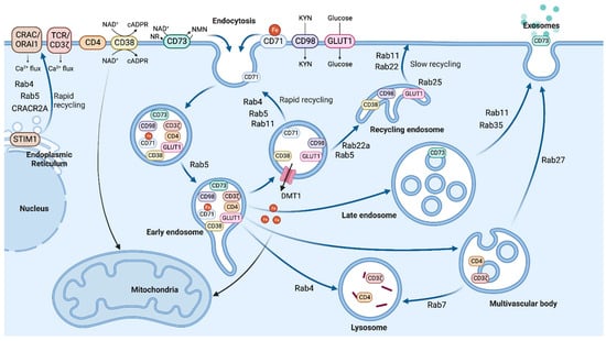 | CD98 (↑) | Rab22a | Kynurenine | NAD+ synthesis | - | [158,159,160] |