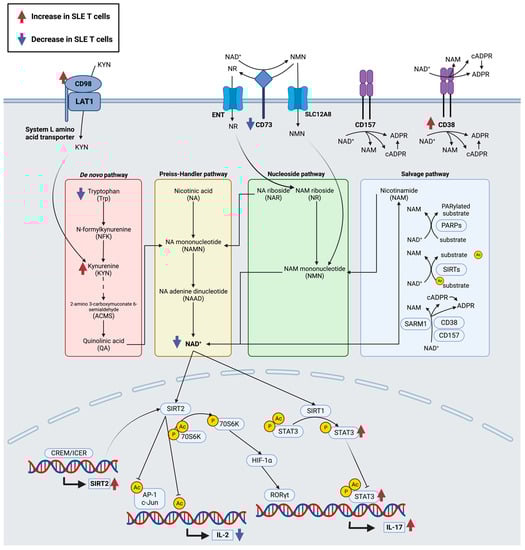 | NAD+ (↓) | Sirtuin-1/STAT3 | Increase Th17 | [174,175,176,177,312,313] | ||