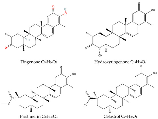 Two-dimensional canonical structural display of compounds analyzed in this study. Synonyms: hydroxytingenone = beta-hydroxytingenone; maytenin = tingenone.
