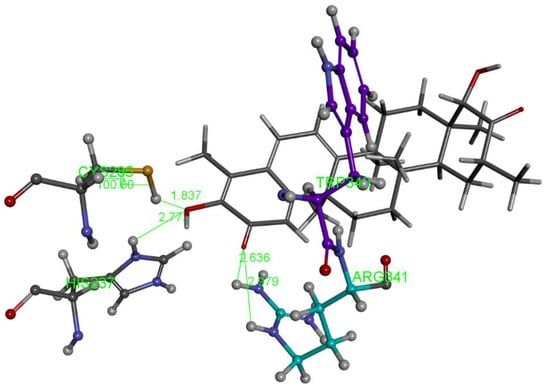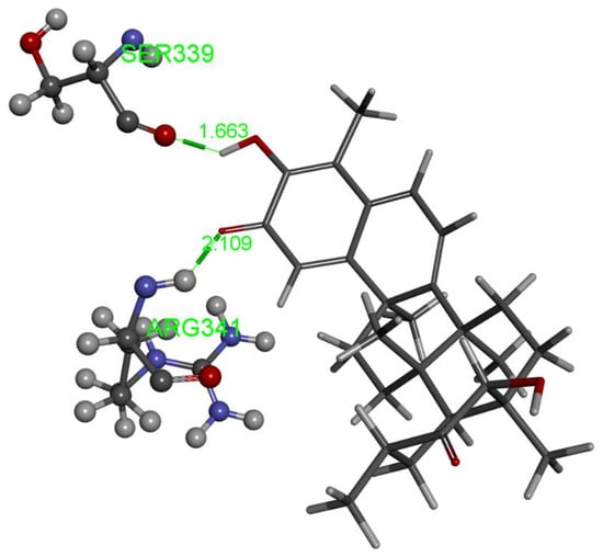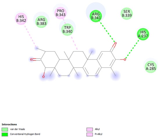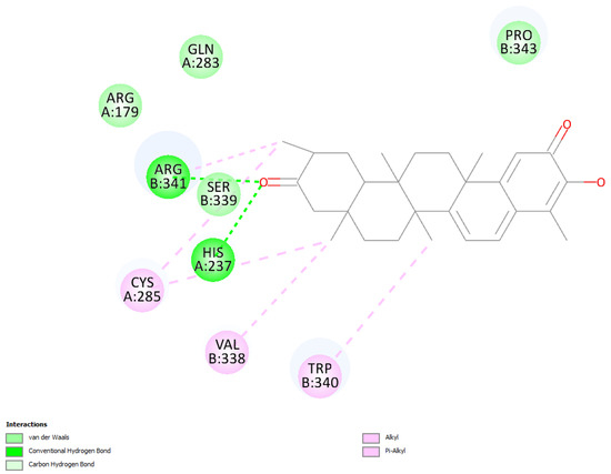 The last docked compound was pristimerin. Pose 4 belongs to the most populated cluster that includes poses 7 and 10. Its Cdocker interaction energy is −26.8 kcal/mol. There is a methide-quinone moiety involved in this cluster, interacting with Arg341 and π-sulfur Cys285 Figure 9 and Figure S4. Dynamics confirms the arrangement and, after calculating binding energy, −9.4 kcal/mol, Figure 10 shows three successive amino acid residues involved, Ser339-Trp340-Arg341, forming H-bonds of 1.524 Å, 2.297 Å and 2.370 Å, respectively.
