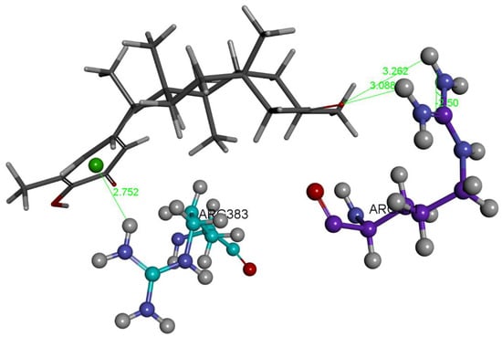 Our next docked compound was tingenone. Its atomic coordinates were derived from hydroxytingenone and minimized with Dmol3. Poses 1 and 5 are representatives of well-distinguished clusters in the docking as the first includes poses 2–4, 6, and 8, whereas pose 5 cluster includes poses 7 and 9. Pose 1 has Cdocker interaction energy −27.9 kcal/mol and shows interactions with the non-methide-quinone carbonyl, involving Arg341 and His237, see Figure 5 and Figure S2. After the standard dynamics cascade, pose 1 is confirmed and the final arrangement obtained after binding energy calculations, −11.8 kcal/mol, is shown in Figure 6; this does not include His237. Interestingly, a cation-π interaction from another arginine, Arg383, is present at the other end of the molecule involving the methide-quinone moiety (2.752 Å) and so this pose appears tightly bound at the active site.