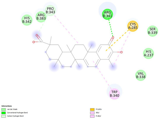 Pose 4. Pristimerin docking results, two-dimensional display. Cys285 shows π-sulfur interaction with the methide-quinone ring and Arg341 has a H-bond to the methide-quinone O(carbonyl).