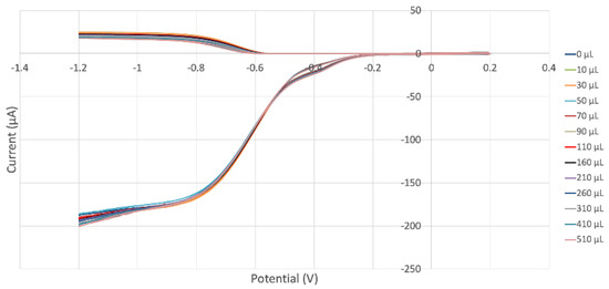 In our laboratory, we developed an electrochemical method for the direct and quantitative analysis of scavenging superoxide [24]. Figure 11 shows a collage of the voltammograms associated with such an experiment for sample MORUnica (stem extract). The bottom part of the figure shows the amount of superoxide generated after reduction of bubbled O2 in the electrochemical cell (reaction (1), see Section 3.3); this is detected at the disk electrode. The top part of the figure shows superoxide detected at the ring electrode. The first experiment is a blank indicated as a 0 µL line; the last one shows the minimum amount of detected superoxide, for aliquot 510 µL. Each added aliquot decreases the current intensity detected at the ring electrode, and this is due to superoxide consumed by the antioxidant components of the extracts. For each voltammogram, the ratio ring current/disk current is defined as the efficiency. The physical interpretation is also associated with the time the generated superoxide (at the disk) takes to reach the ring and be oxidized.