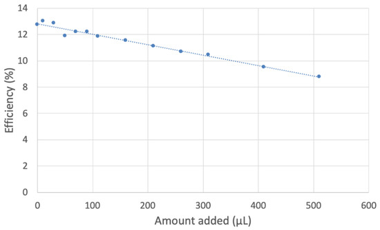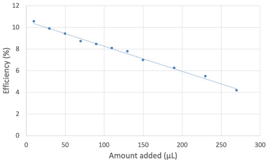 In Figure 12, the efficiency of all added aliquots is included, i.e., the collection efficiency is shown at the y axis, while the x axis shows the volume of added aliquot; ultimately, the slope of the line is associated with the antioxidant capability of scavenging. Figure 13 and Figure 14 show equivalent graphs for MOHUnica (leaf extract). Table 2 includes slopes of other natural products studied using the same method. This shows both Maytenus octogona extracts having weaker antioxidant activity, compared with olive oil. This is probably due to the depletion of antioxidants during ethanolic sample preparations of Maytenus octogona extracts, in contrast with cold-extracted extra virgin olive oil [25].